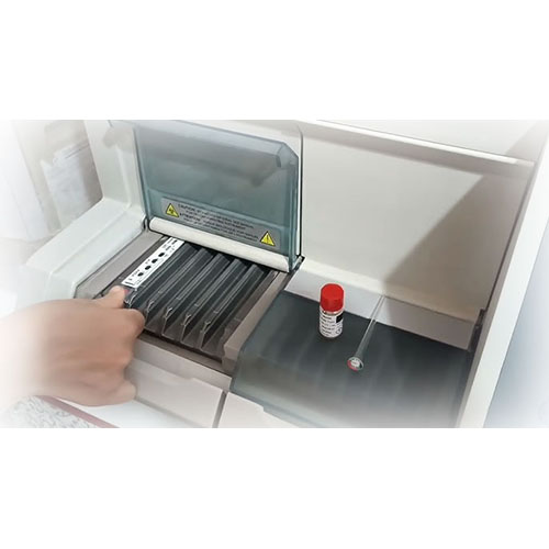 将即可用试剂条插入仪器中,系统自动进行整个免疫分析的预温、吸样、量度、分析及打印结果等不同步骤,系统可以同时上机不同检测项目,具体是每个模块2个相互独立的反应仓,每个仓还有6个独立检测通道,各仓独立运行、独立控温,可灵活选择一个仓或两个仓启动